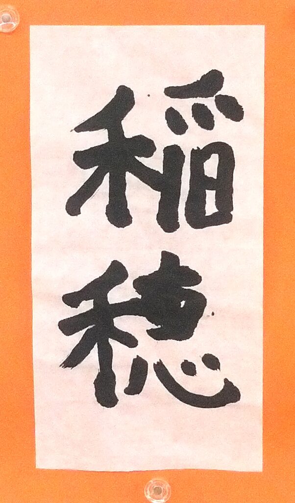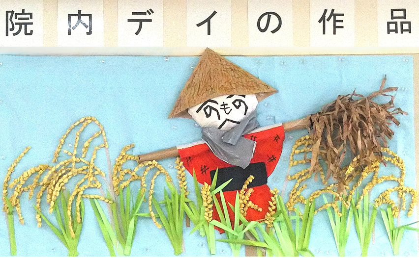 見事に大きく実った稲穂と、稲穂を守る立派な案山子です。