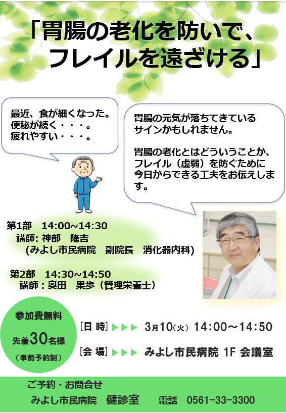 健康講座「胃腸の老化を防いで、フレイルを遠ざける」3月10日14時~ 開催のお知らせ 2026年2月12日 最終更新日時 : 2026年2月13日 mmh_admin 「胃腸の老化を防いで、フレイルを遠ざける」をテーマに、健康講座を開催します。 講師は、神部副院長と奥田管理栄養士です。 詳しくは ↓ のポスターをご覧ください。(クリックすると、大きく表示できます。) お申し込みは0561⁻33⁻3300へお電話、もしくは健診室受付へ直接、もしくは ↓のお申込みメールフォームよりお気軽にどうぞ。 お申込み メールフォーム みよし市民病院では、定期的に様々なテーマの健康講座を行っています。 詳細は↓をクリックして、ご覧ください。 院内講座のお知らせ