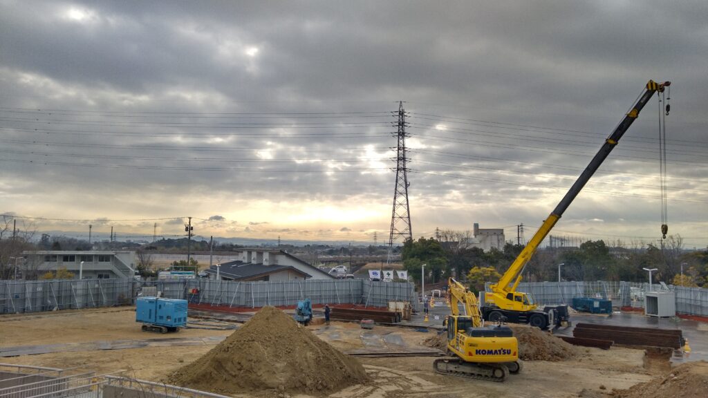 朝焼けに照らされている工事現場です。