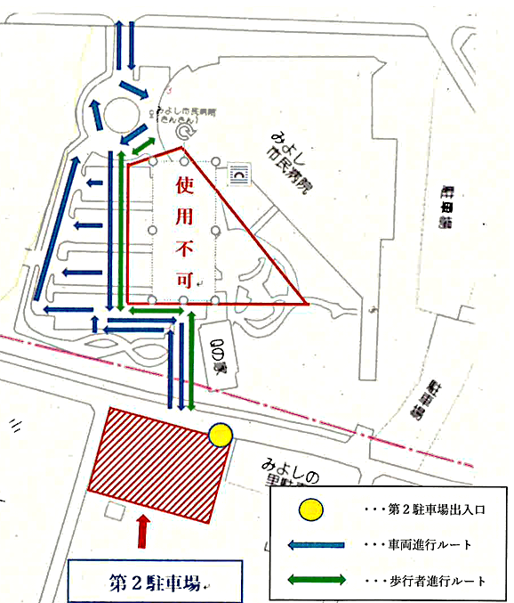 医療介護連携拠点施設の建設のため、下記の工事期間は、正面駐車場の一部(北側)が使用できなくなります。それに伴い、病院の東側に第2駐車場を新設しましたので、ご利用いただきますようお願いいたします。ご不便をお掛けして大変申し訳ありませんが、ご理解とご協力をお願いいたします。