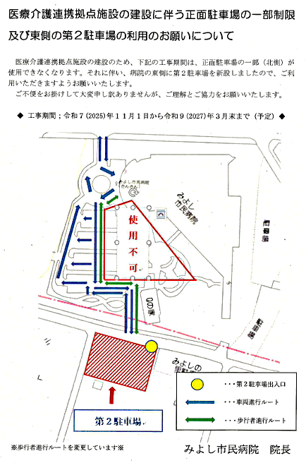 正面駐車場が一部使用できなくなります。 2025年11月4日 最終更新日時 : 2025年11月4日 mmh_admin 医療介護連携拠点施設の建設のため、下記の工事期間は、正面駐車場の一部(北側)が使用できなくなります。それに伴い、病院の東側に第2駐車場を新設しましたので、ご利用いただきますようお願いいたします。 ご不便をお掛けして大変申し訳ありませんが、ご理解とご協力をお願いいたします。 ◆ 工事期間 令和7(2025)年 11月 1日 から令和9(2027)年 3月 末まで (予定)◆
